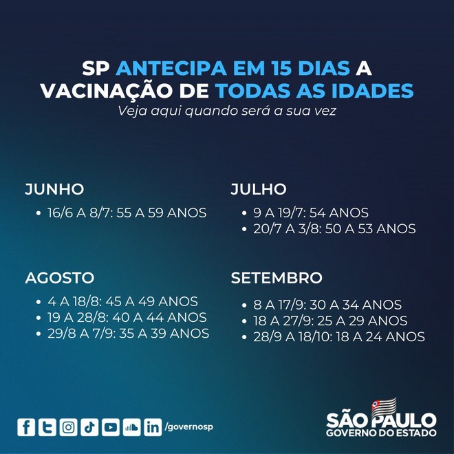 Vacinação para quem tem 29 anos começa na próxima terça em sp. A vacinação deve ser entendida como um direito e um dever dos cidadãos, participando ativamente as pessoas que recusem a vacinação, com todas ou alguma vacina incluída no programa nacional. Novo calendário de vacinação indicado pelo governo estadual para os municípios de são paulo. Os 24.244.645 vacinados que receberam a 1ª dose equivalem a Veja as novas datas de vacinação contra a covid em sp.